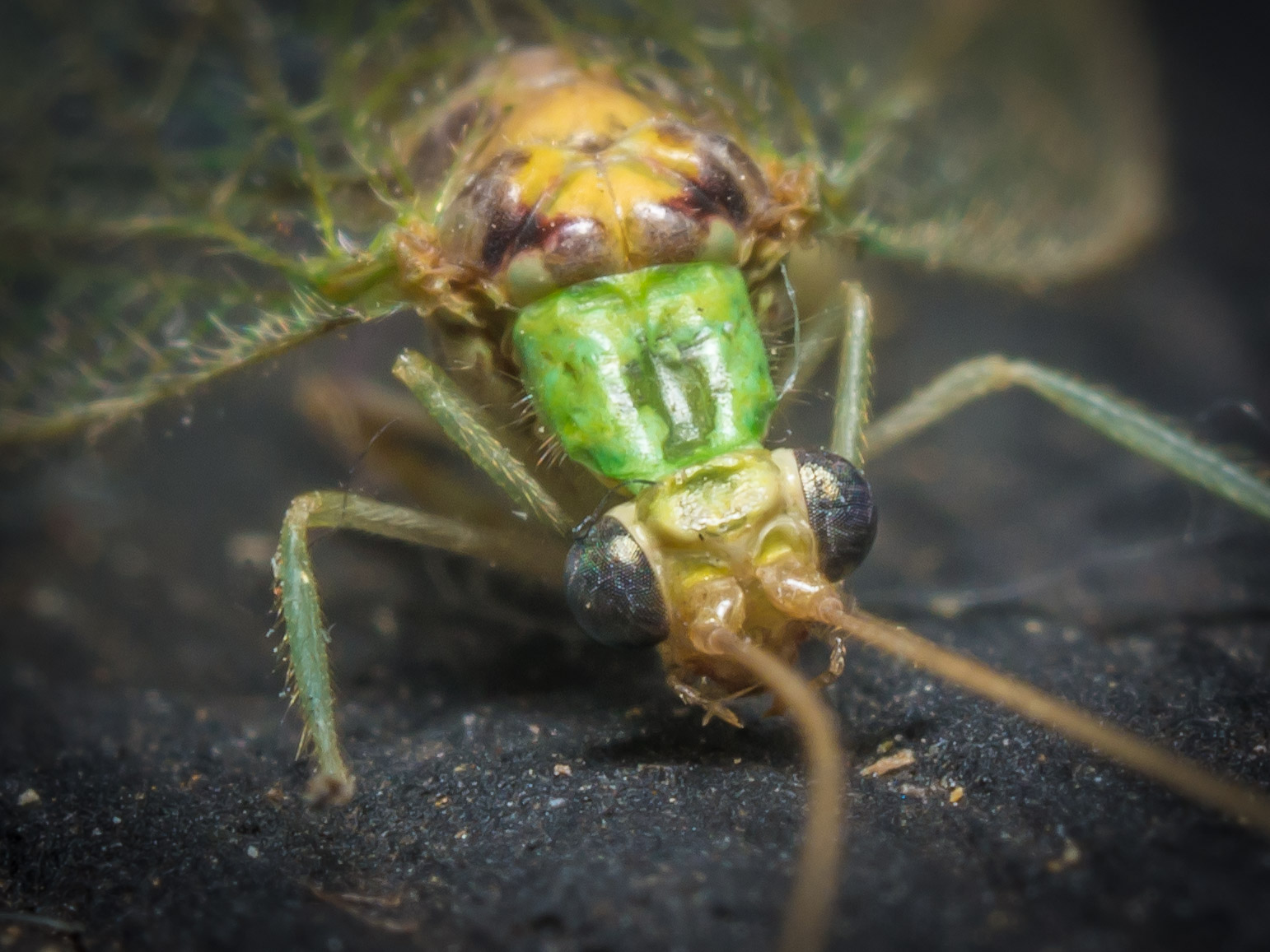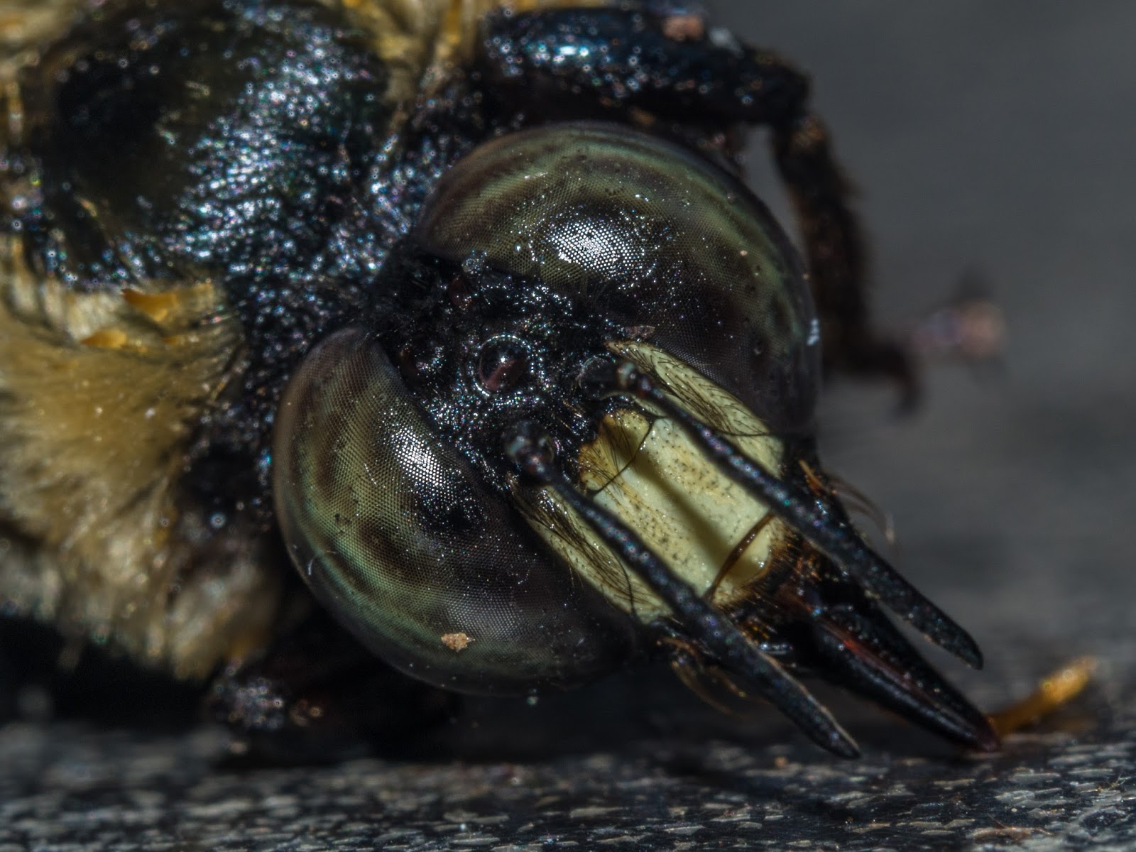 This guy is the author of that perfectly round hole, a carpenter bee. I learned they can make extravagant tunnels in wood, with the only sign being a perfectly round hole like the above: