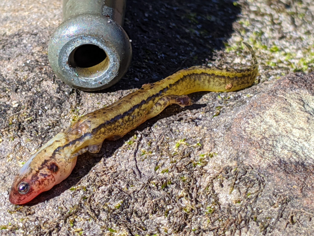 Brown, textured frog perched on a rough rock; close-up of its eye and front legs.