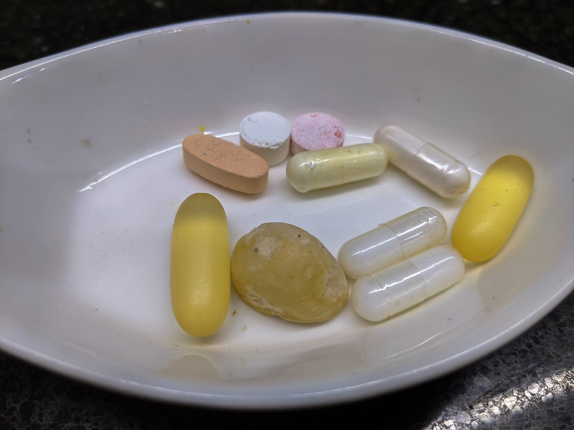 Stupid trick of the month: attempt to swallow your daily collection of supplements without noticing that a macadamia nut has fallen into the mix: