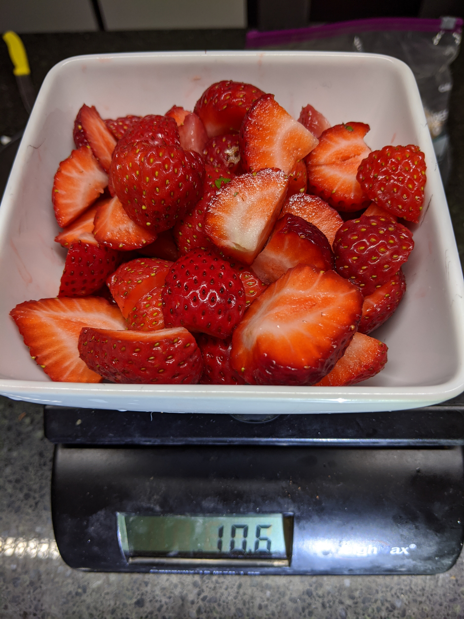 Putting 100 calories of various foods on a scale really made an impression my naïve stomach. A full bowl (10 oz) of delicious strawberries has the same calories as a handful of peanuts, or 0.7 oz of peanut butter or chocolate!