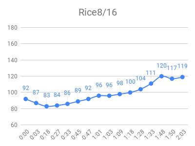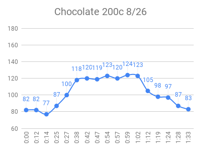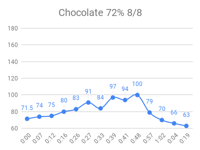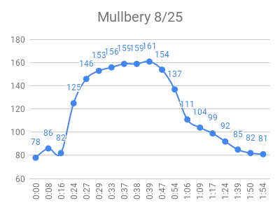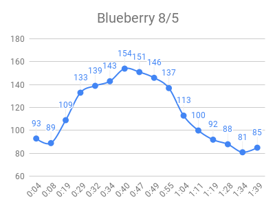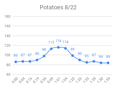 I downloaded the data from libreview.com (button on upper right of glucose history page), then imported to this google sheet. I manually tweaked each test to make these charts, sorted with highest peak first: