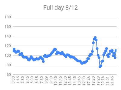 I’ve been doing the ‘time restricted’ eating thing for about a year, with a eating window between 6pm -> 10pm. The rise between 9 -> 10 am is from a morning exercise routine.