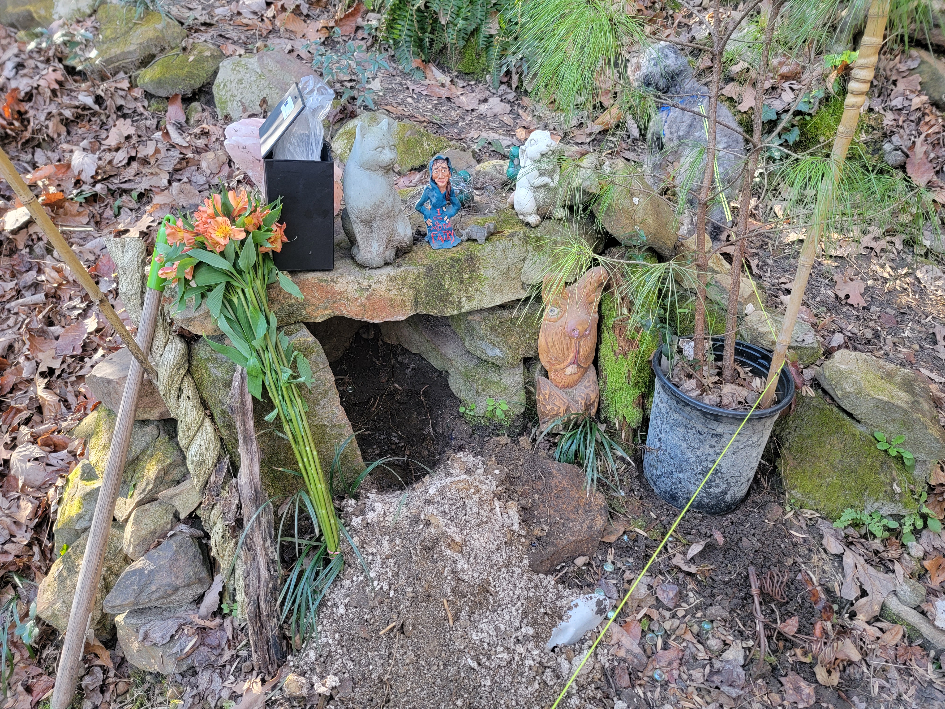 We buried Helen’s ashes in a beautiful spot next to our creek waterfall, along with Irina and Boris. Aya made that blue figurine when she was in grade school … Helen loved it:
