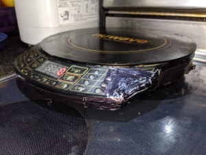 Helen inadvertently did a experiment of her own, testing the melting limit of a induction plate that we (unwisely) keep on top of our old school electric stove top: