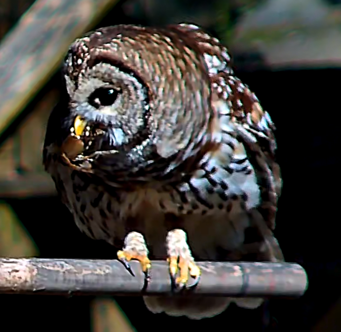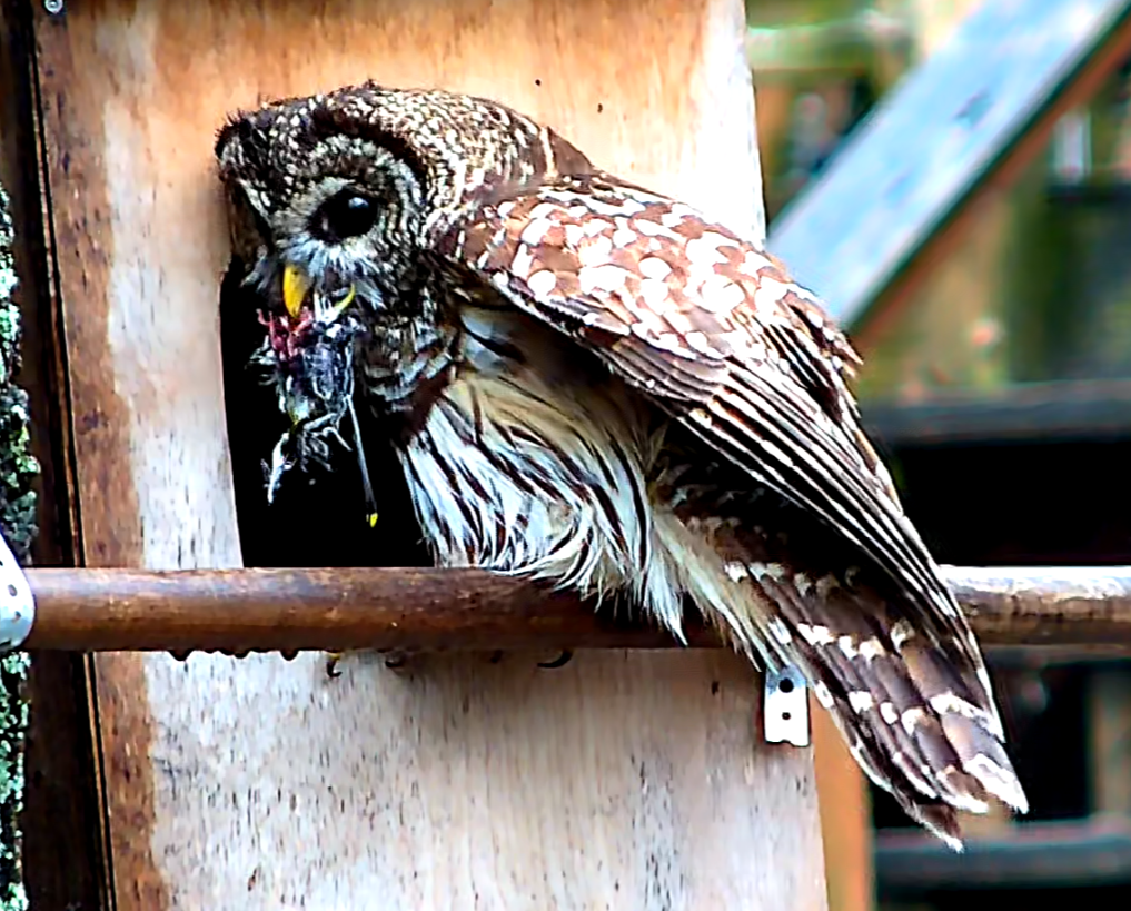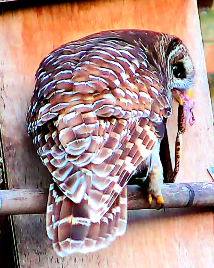 The owl house is hanging in there. He is keeping her well fed with birds, crawfish, and snakes: