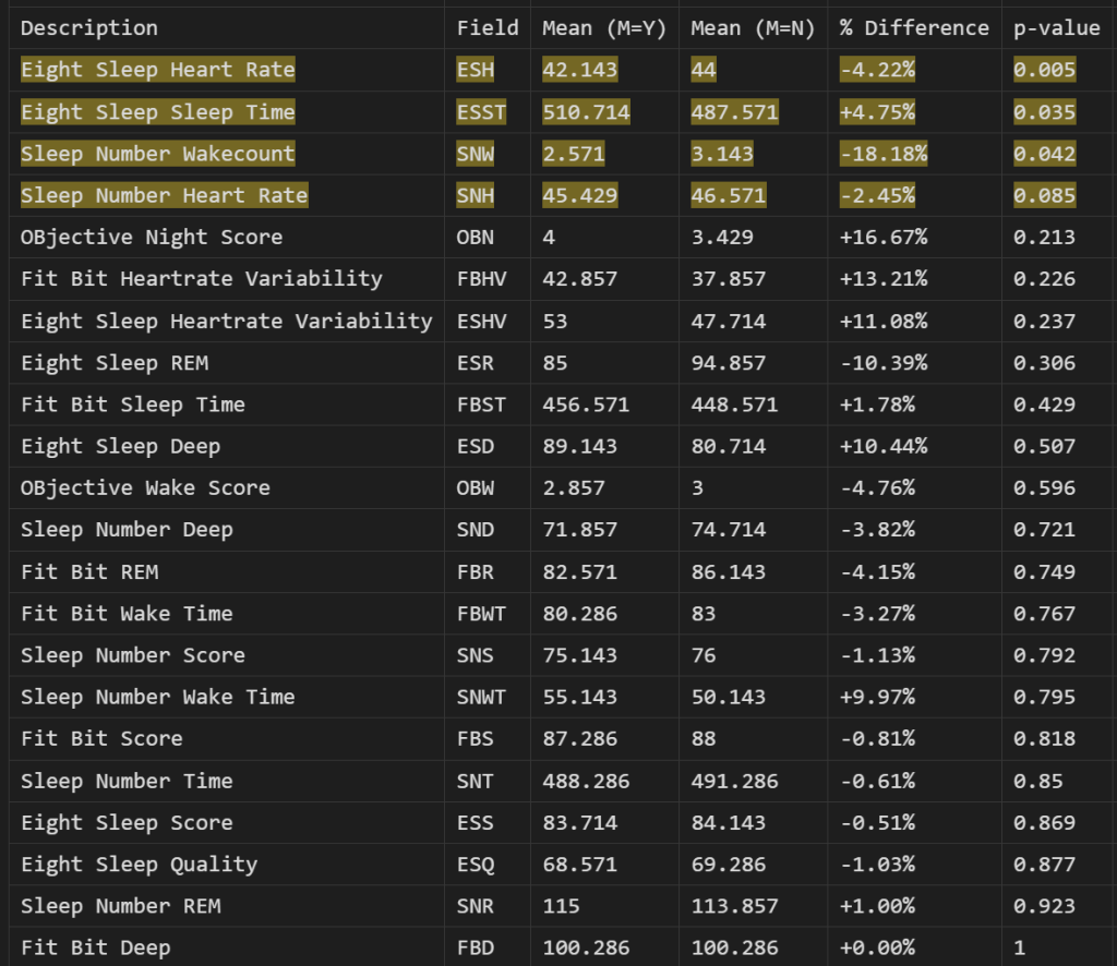 Only the first 3 metrics were statistically significant: Heart rate decreased by 4%, sleep time increased by 5%, and number of awakenings decreased by 18%. Not huge differences, but I’ll take what I can get 🙂
