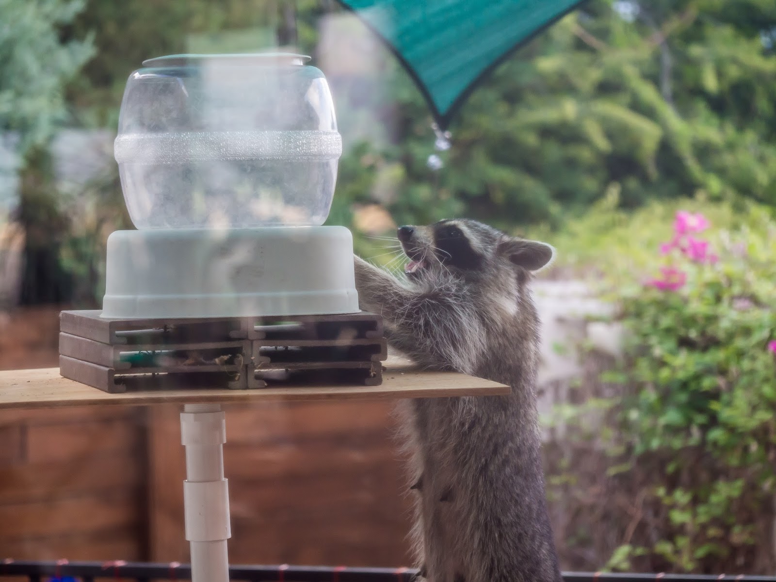 Last month’s anti-raccoon cat food feeder got a small upgrade after they ate through my duct tape and feasted. I used screws this time. They got so frustrated they even tried some daytime raids, to no avail:
