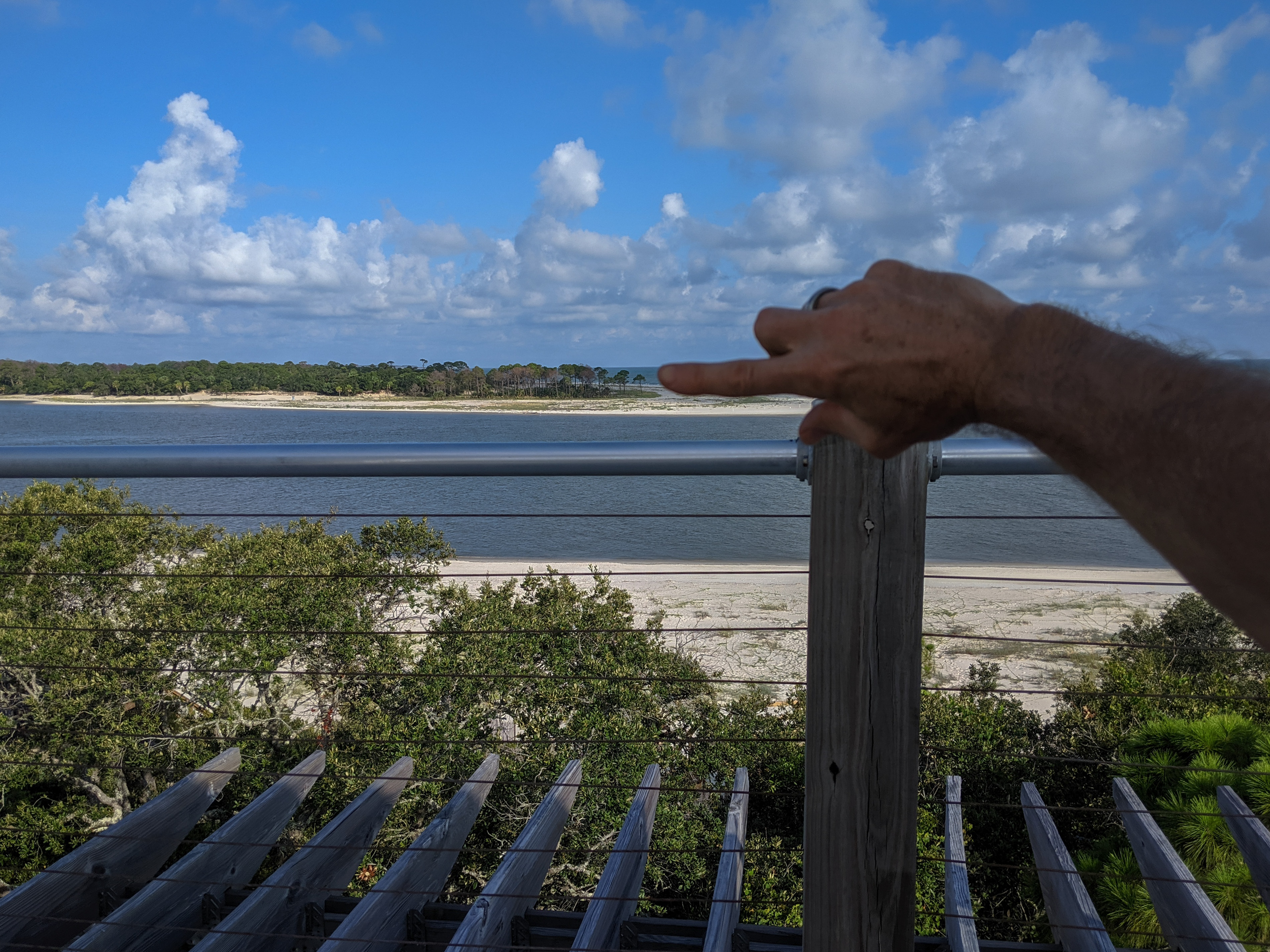 Beautiful view of St Vincent’s Island. Using my finger and guessing the height of a tree, I used geometry to calculate the distance to the island at 2000′, within 10% the 1800′ that google maps said: