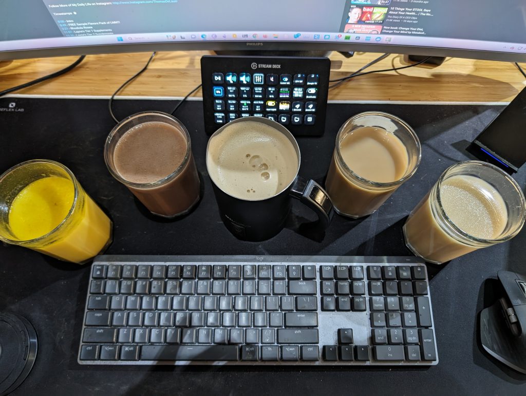 One of the tricks I use to get down to eating only one meal a day is drinking. The good kind š Water is good, but there are plenty of healthy low-calorie drinks. My current go-tos: golden milk (turmeric), cocoa, frothed coffee (mostly decaf), matcha green tea, Earl Grey tea: