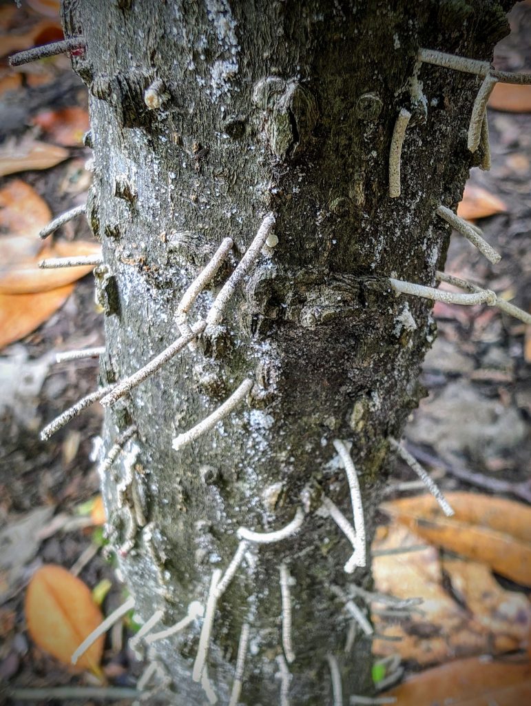 Saw something new on the forest. Looks like Laurel Wilt, although I’m not sure as I don’t think I have any trees in the Laurel family. Those pimple-like strings are sawdust ejected by an invasive beetle:
