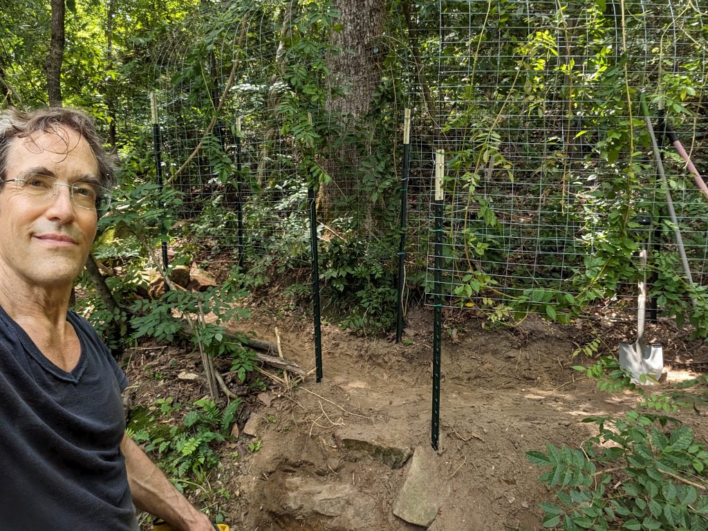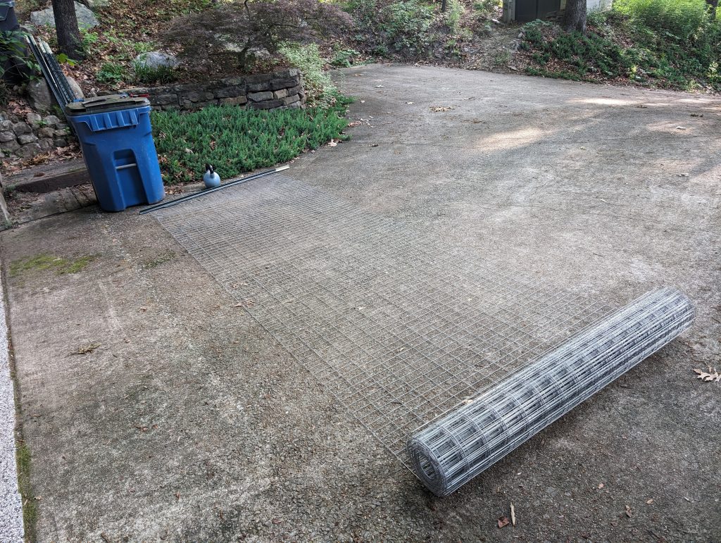 I also have a bunch of wild wisteria, so this month I built another trellis, this time using wire: