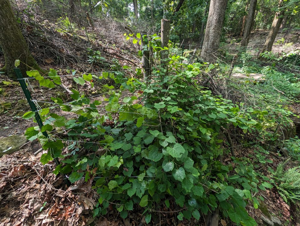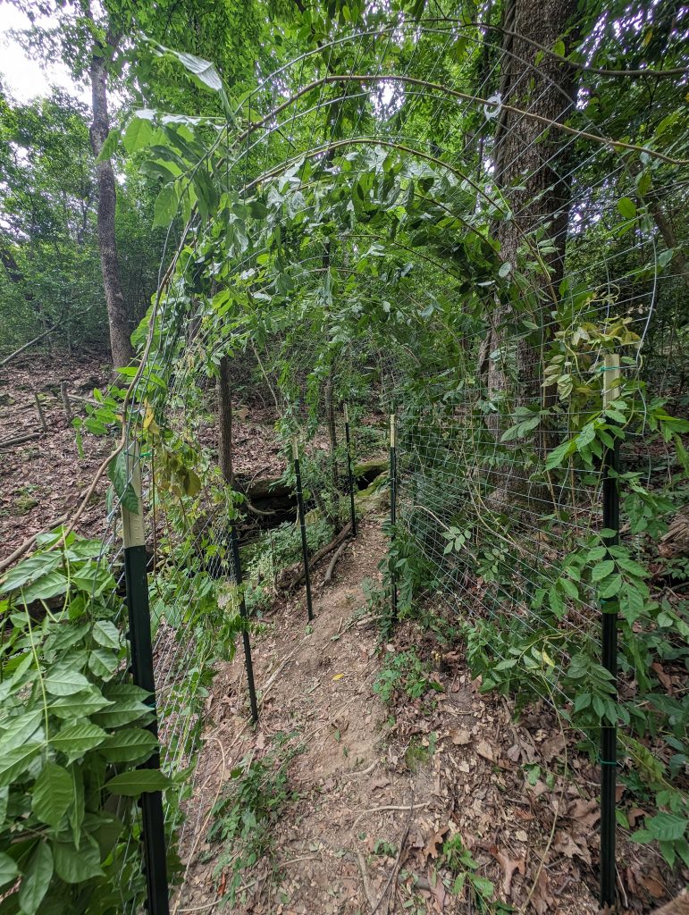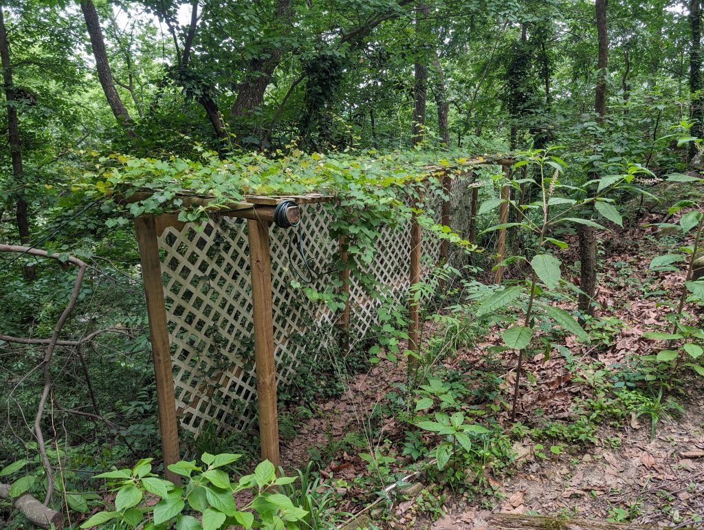 A couple of years ago I built a trellis hoping to grow a grape tunnel. Slowly getting there: