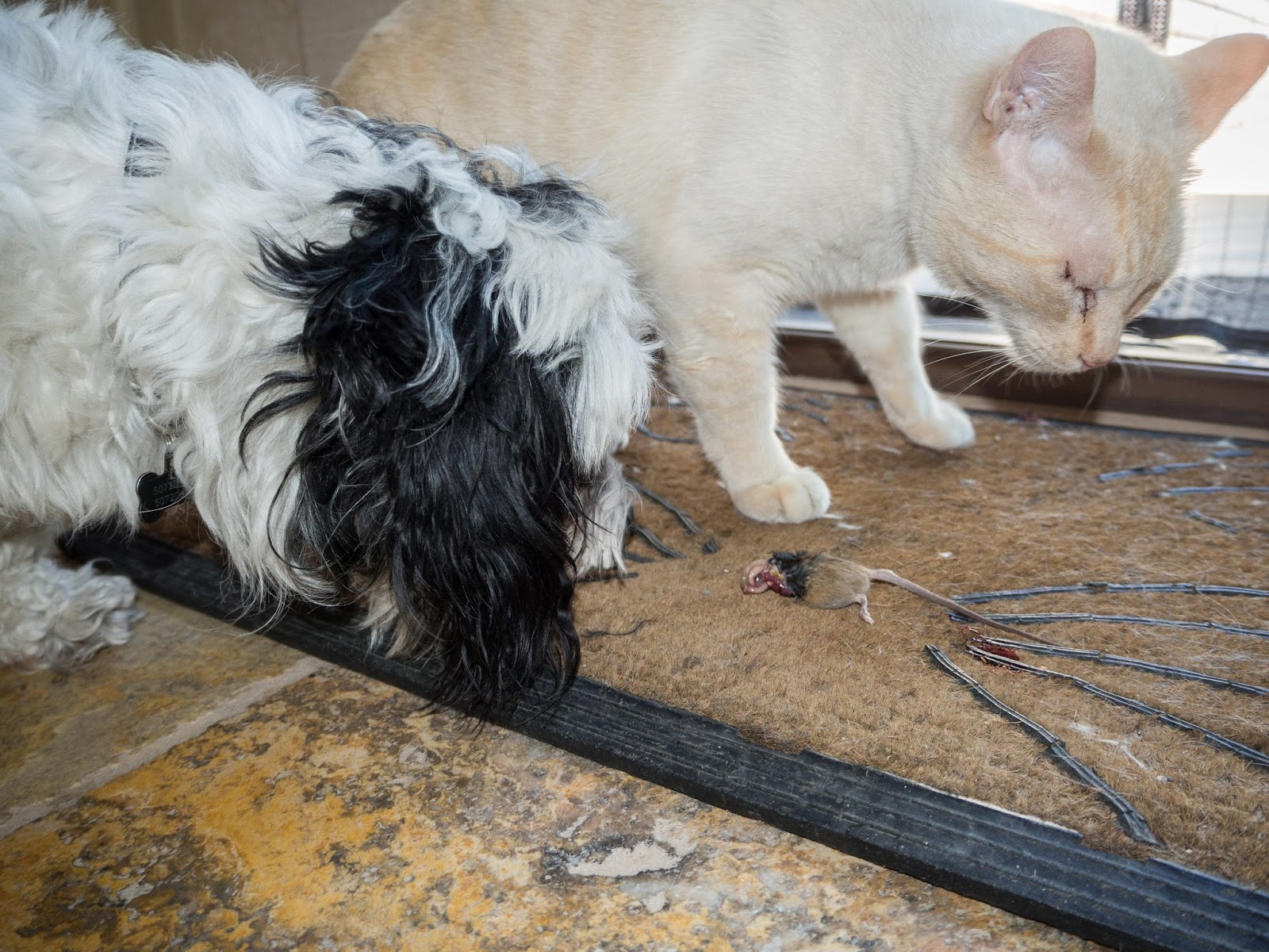 The cat caught the dishwasher mouse he has been patiently stalking for about a year. He quickly ate the head, as is the way of cats, but was willing to share the body with the rest of us: